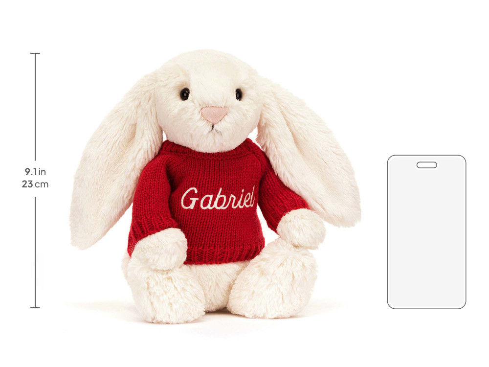 Bashful Cream Bunny is a super soft beloved Jellycat and can now be made extra special with a personalised red jumper! With a choice of fonts and thread colours, your bunny can truly be one of a kind!