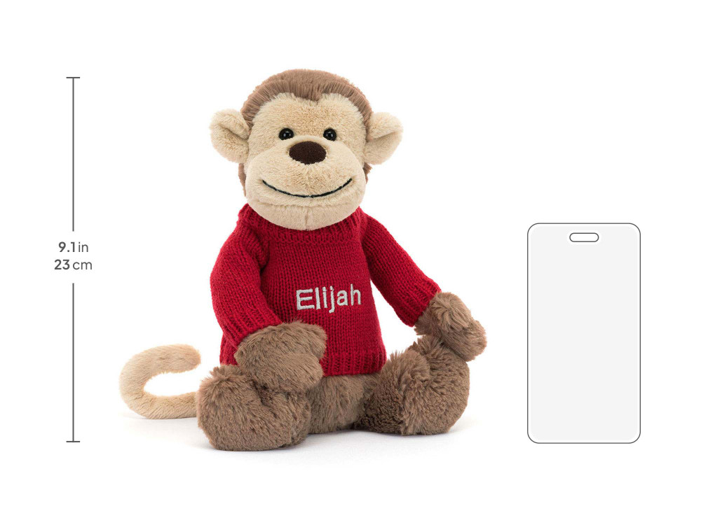 Bashful Monkey is a super soft beloved Jellycat and can now be made extra special with a personalised red jumper! With a choice of fonts and thread colours, your monkey can truly be one of a kind!
