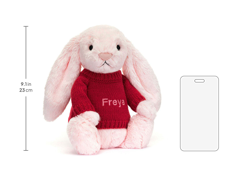 Bashful Pink Bunny is a super soft beloved Jellycat and can now be made extra special with a personalised red jumper! With a choice of fonts and thread colours, your bunny can truly be one of a kind!